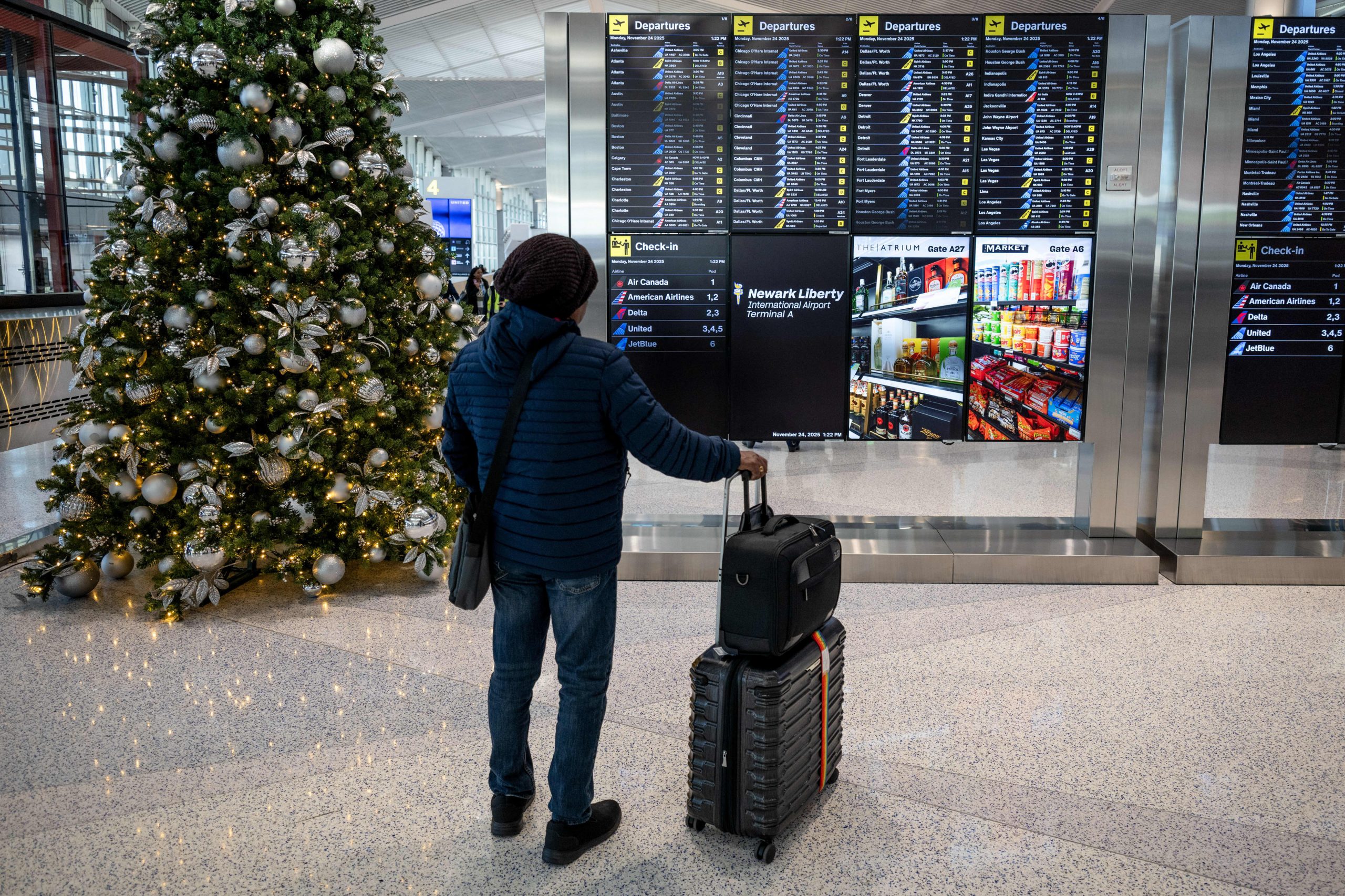 A traveler near a departures board at Newark Liberty International Airport (EWR) in Newark, New Jersey, US, on Monday, Nov. 24, 2025.