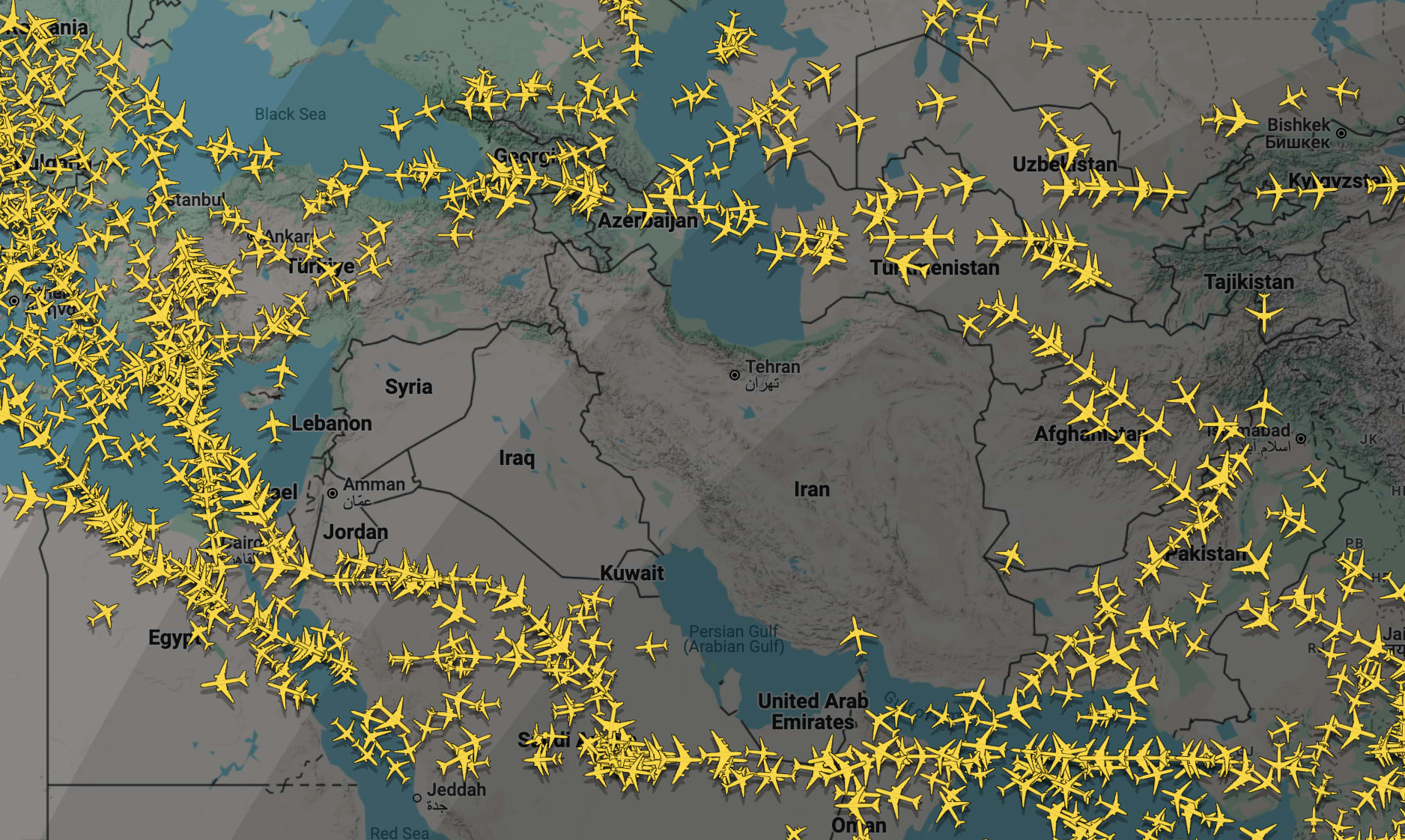 Airspace over the Middle East on Monday afternoon EDT, according to FlightRadar24.