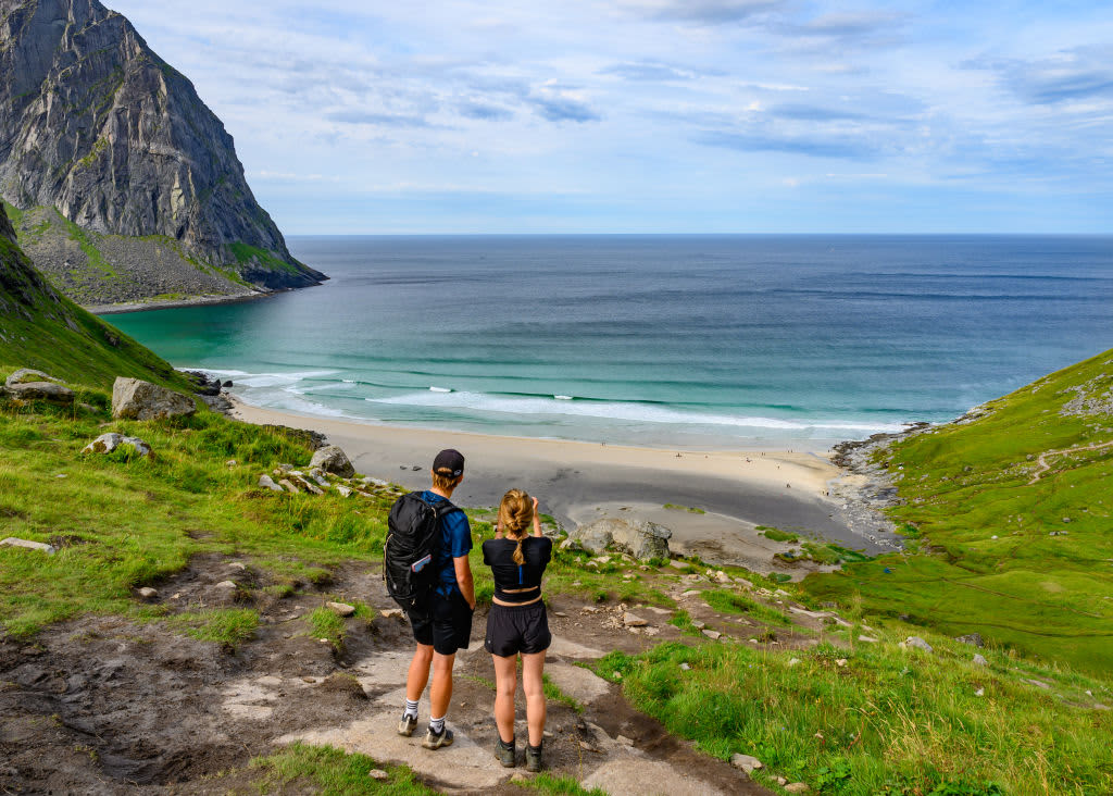 The secluded bay of Kvalvika on the Lofoten archipelago in northern Norway in the Norwegian Sea.