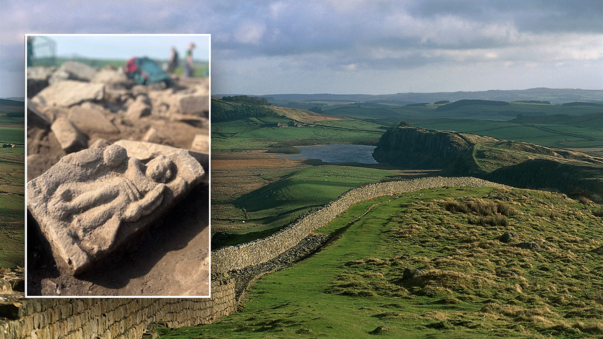 Volunteers recently discovered an ancient Roman goddess depiction, shown in inset, at Vindolanda near Hadrian’s Wall — highlighting the site’s historical significance. (The Vindolanda Trust; Getty Images )