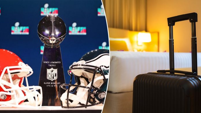More than 25 hotels are fully booked from Saturday Feb. 8, to Monday, Feb. 10, according to Hotels.com search results — and even budget-friendly stays are costing Chiefs and Eagles fans a pretty penny.