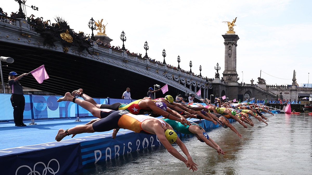 Athletes are shown diving into the Seine to start the swimming stage of the men’s individual triathlon at the Paris 2024 Olympic Games in central Paris on July 31, 2024. (ANNE-CHRISTINE POUJOULAT/AFP via Getty Images)