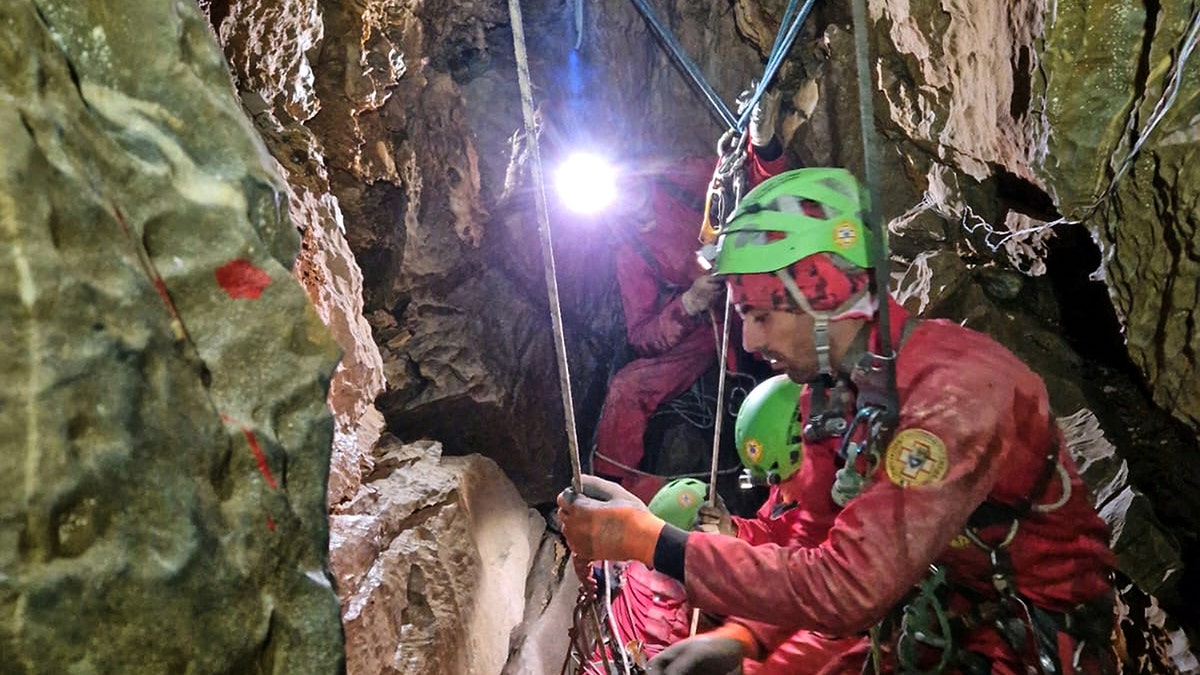 Italian rescue teams extracted an injured cave explorer from 130 feet below the surface in the Abisso Paperino cave system. (National Alpine and Speleological Rescue Corps via AP)