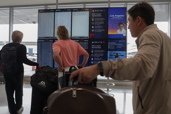 A travelers check flight information at LAX as the shutdown passes the one-month mark, leaving essential workers unpaid in Los Angeles, California, on November 5, 2025.