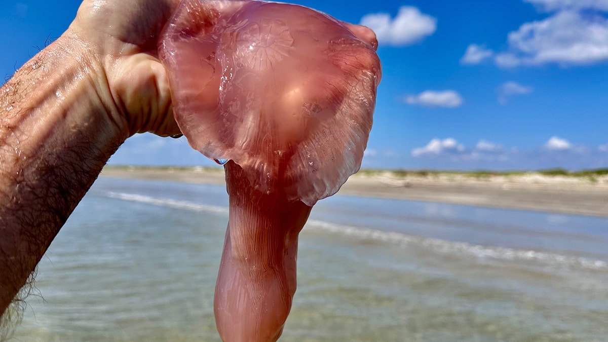 Pink meanie jellyfish, named for their “mean” behavior of eating other jellies, can grow up to 50 pounds and have tentacles stretching as long as 70 feet. (Jace Tunnell, Harte Research Institute at Texas A&M University-Corpus Christi)