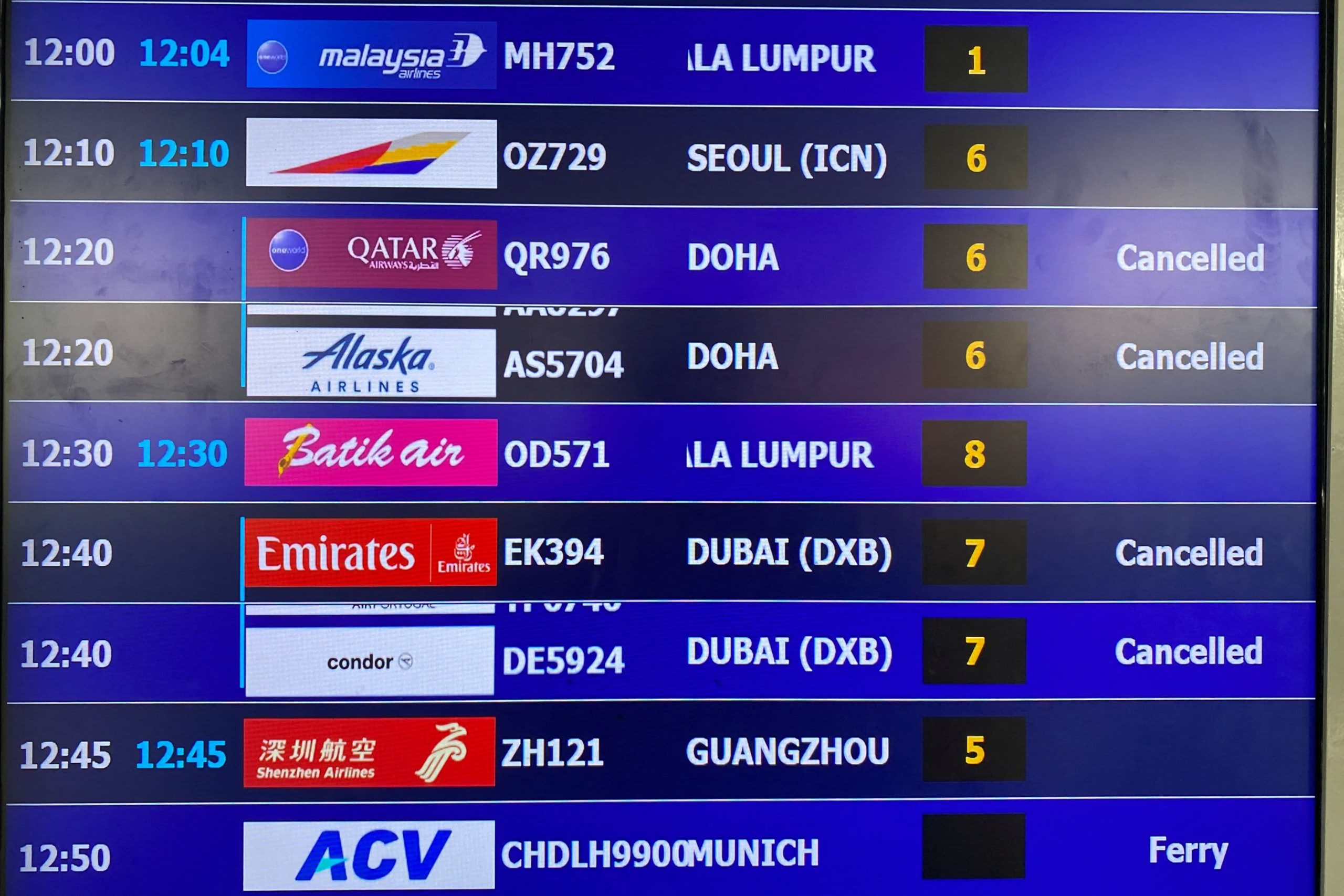 A display board shows canceled flights to Dubai and Doha amid regional airspace closures at Noi Bai International Airport, amid the U.S.-Israel conflict with Iran, in Hanoi, Vietnam, March 2, 2026. Picture taken with a mobile phone.