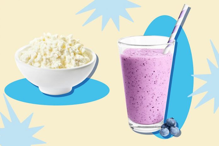 A photo illustration shows a bowl of cottage cheese and a berry smoothie and a straw in a glass.